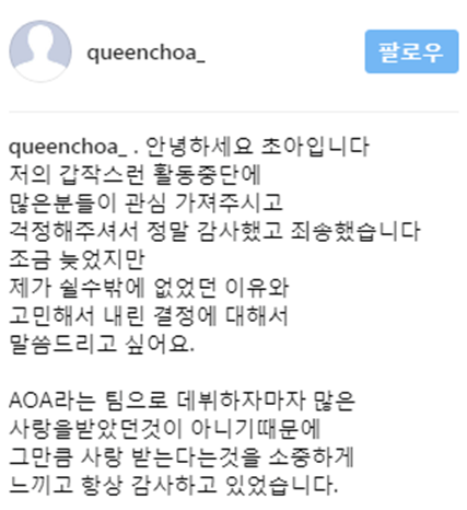 2012년 AOA 메인보컬이자 맏언니로 데뷔한 초아는 전성기를 누리던 2017년 갑작스럽게 팀을 탈퇴하고 방송활동을 중단했다.
