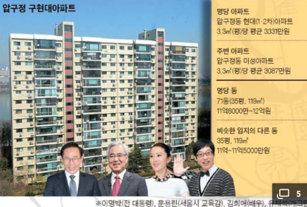 또한 구식 아파트임에도 매년 가격이 초고가로 상승 중이다. 때문에 대기업 고위 임원들이나 톱스타 연예인, 정치인이 거주하기로 유명하다.