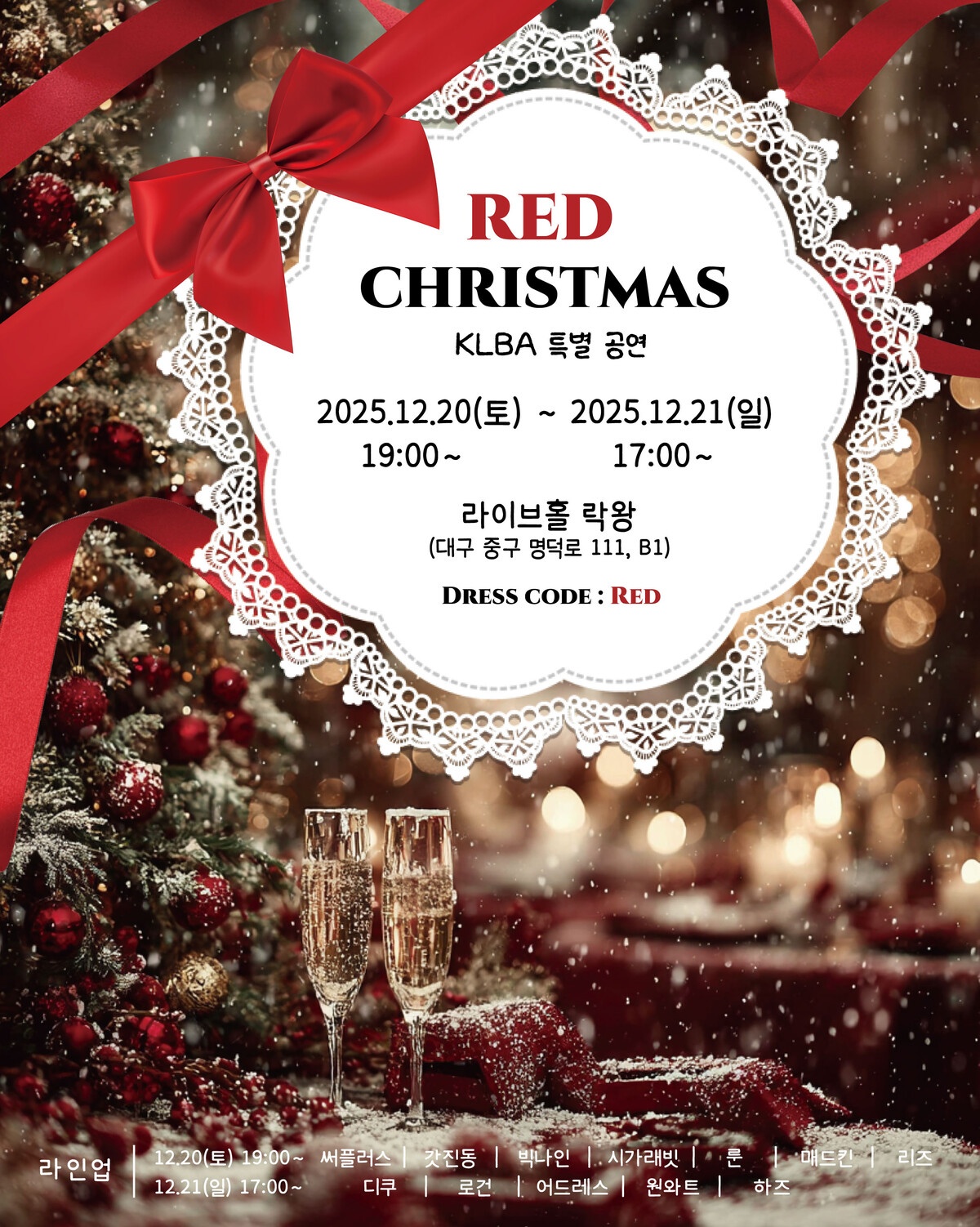KLBA관계자와 대구공연예술문화 관계자는 “RED CHRISTMAS는 지역 밴드 신의 저력을 보여주는 동시에 크리스마스 시즌의 감성을 함께 나누는 자리”라며 “현장의 생생한 에너지와 연말 정취를 동시에 느낄 수 있는 기회가 될 것”이라고 말했다.