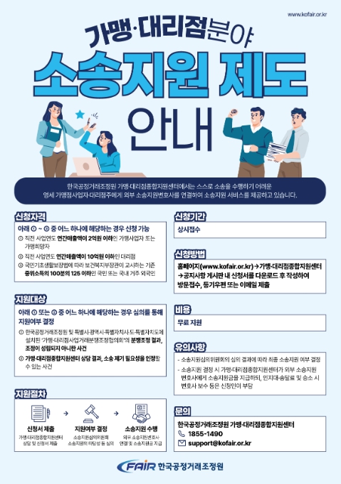 조정원의 소송지원제도는 생업 또는 경제적인 여건상 스스로 소송을 수행하기 어려운 영세 가맹사업자 및 대리점주를 대상으로 소송지원변호인단을 활용하여 소송비용을 지원하는 제도이다. 이는 공정위의 행정제재만으로는 부족했던 민사적 손해배상을 실현할 수 있는 효과적인 수단이다.